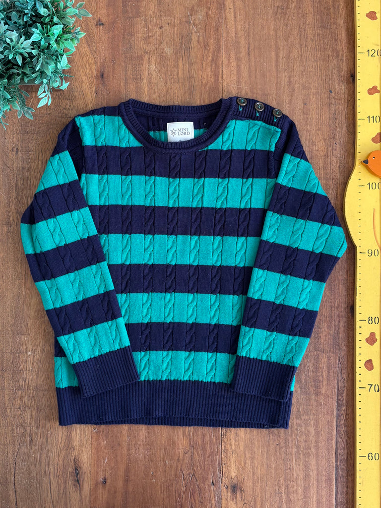 Suéter infantil em tricô com textura trançada. Confortável e quentinho, ideal para dias mais frios e para compor looks casuais ou mais arrumadinhos. Marca: Mini Lord. Modelo Unisex. Tamanho: 8 anos. Cor: Verde e azul-marinho listrado. Material: Tricô encorpado. Detalhe: botões no ombro. Estado: Ótimo estado de conservação.
